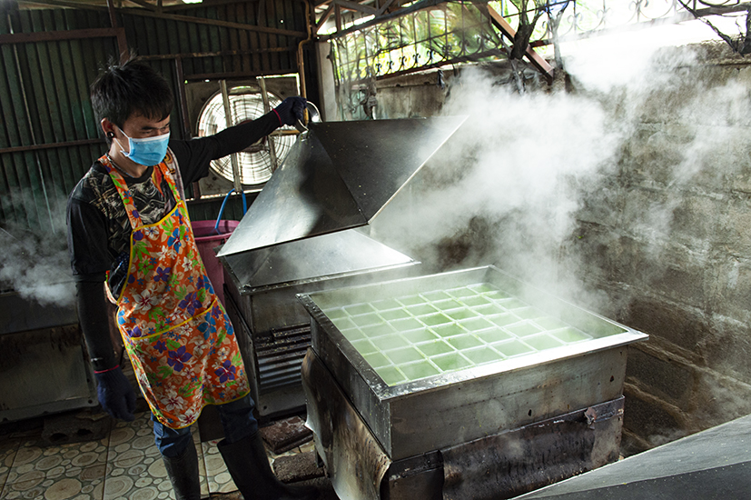 ขนมชั้นก็เหมือนกันกวนแป้งขนมชั้นตามสูตรของทางบ้านทวีศรี เสร็จแล้วนำไปหยอดลงในถาดพลาสติก ที่วางอยู่ในเตานึ่งอีกที นึ่งให้สุกที่ละชั้นตามเวลาที่กำหนดของทางร้าน เปิดฝาเตานึ่งออกควันไอน้ำพุ่งลอยตามขึ้นมาด้วย ได้ขนมชั้นสีสด 3 สี พร้อมส่งขาย สีที่คนนิยมสั่งก็มี สีชมพู สีเขียว สีม่วง โดยสีทั้งหมดใช้สีจากทำธรรมชาติ เพื่อให้ได้ขนมชั้นที่สะอาดปลอดภัยกับลูกค้า