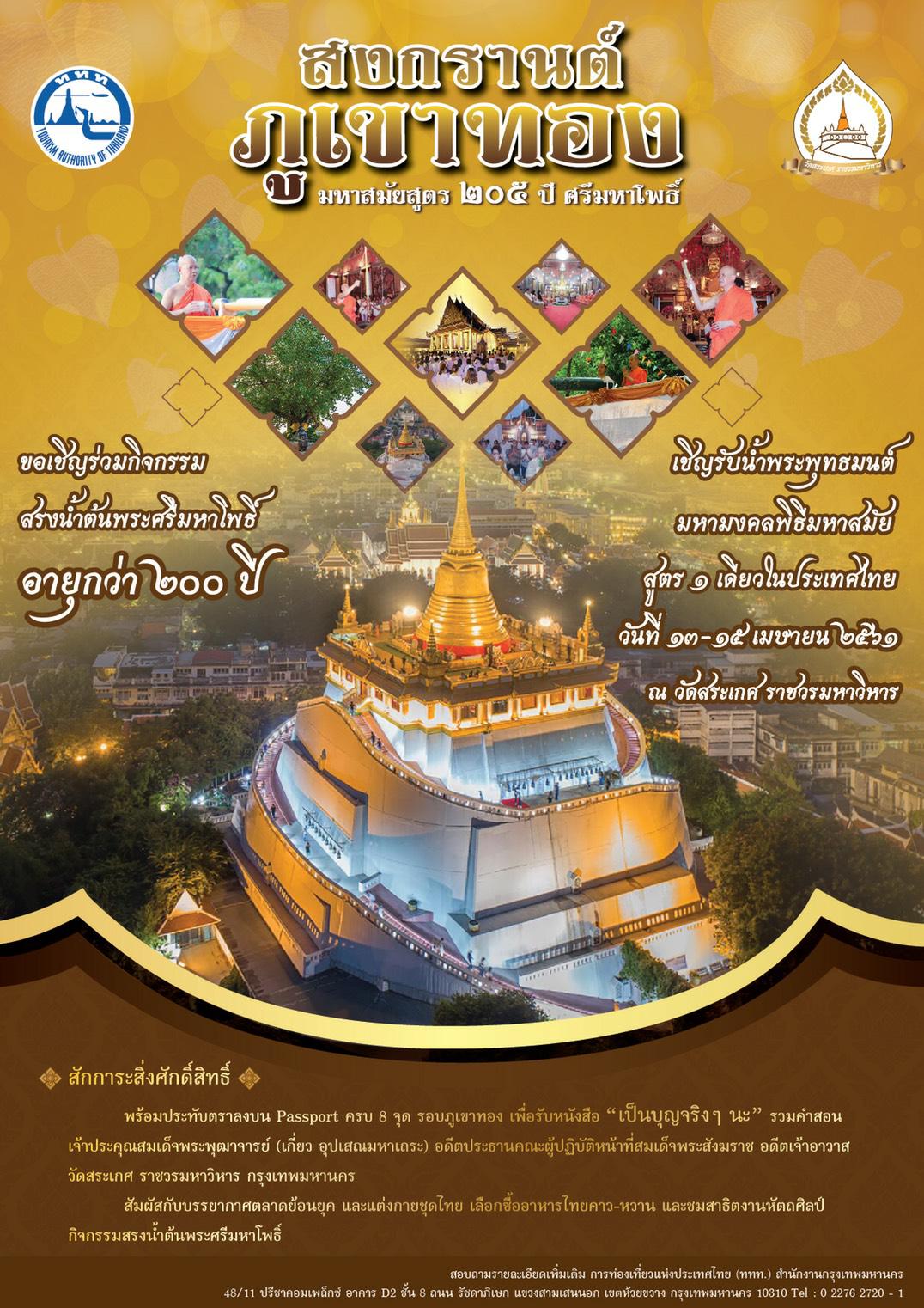 การท่องเที่ยวแห่งประเทศไทย (ททท.) ร่วมกับ วัดสระเกศ ราชวรมหาวิหาร ขอเชิญชวนทุกท่าน ร่วมงาน สงกรานต์ ภูเขาทอง มหาสมัยสูตร 205 ปี ศรีมหาโพธิ์ โดยมีกิจกรรม สำคัญคือ ร่วมสรงน้ำต้น พระศรีมหาโพธิ์ อายุกว่า 200 ปี พร้อมรับน้ำพระพุทธมนต์มหามงคลพิธีมหาสมัยสูตร หนึ่งเดียวในประเทศไทย วันที่ 13-15 เมษายน 2561 ณ วัดสระเกศ ราชวรมหาวิหาร (ภูเขาทอง) กรุงเทพมหานคร งานประเพณีสงกรานต์ ภูเขา ทอง มหา สมัยสูตร 205 ปี ศรีมหาโพธิ์ จะเริ่มขึ้นในวันที่ 13 เมษายน ตั้งแต่เวลา 10.00 น. ของการจัดงานทุกวัน